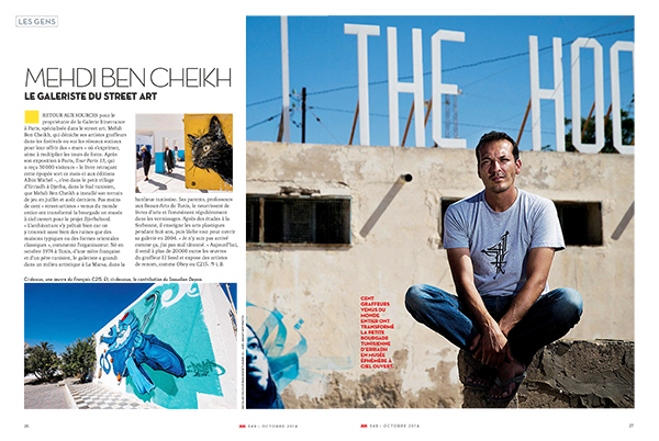« L’architecture s’y prêtait bien car on y trouvait aussi bien des ruines que des maisons typiques ou des formes orientales classiques », commente l’organisateur. Né en octobre 1974 à Tunis, d’une mère française et d’un père tunisien, le galeriste a grandi dans un milieu artistique à La Marsa, dans la banlieue tunisoise. Ses parents, professeurs aux Beaux-Arts de Tunis, le nourrissent de livres d’arts et l’emmènent régulièrement dans les vernissages. Après des études à la Sorbonne, il enseigne les arts plastiques pendant huit ans, puis lâche tout pour ouvrir sa galerie en 2004. « Je n’y suis pas arrivé comme ça, j’ai pas mal tâtonné. » Aujourd’hui, il vend à plus de 20 000 euros les oeuvres du graffeur El Seed et expose des artistes de renom, comme Obey ou C215. ? L.B.