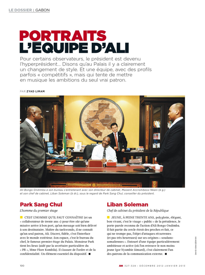 C’EST L’HOMME QU’IL FAUT CONNAÎTRE (et un « collaborateur de trente ans ») pour être sûr qu’une missive arrive à bon port, qu’un message soit bien délivré à son destinataire. Maître du taekwondo, il ne connaît qu’un seul patron, Ali. Discret, fidèle, c’est l’interface avec le monde extérieur. Son espace, c’est le bureau du chef, le fameux premier étage du Palais. Monsieur Park tient les lieux (aidé par la secrétaire particulière du « PR », Mme Flore Kombila). Il s’assure de l’ordre et de la confidentialité. Un élément essentiel du dispositif.